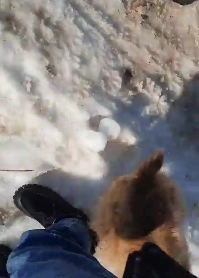 brown cocker spaniel dog on a leash playing in the snow. The dog is rolling around on the ground, shaking its fur, and moving about in the snow. A person wearing blue jeans and black shoes is standing nearby. Some dark debris is scattered in the snow.