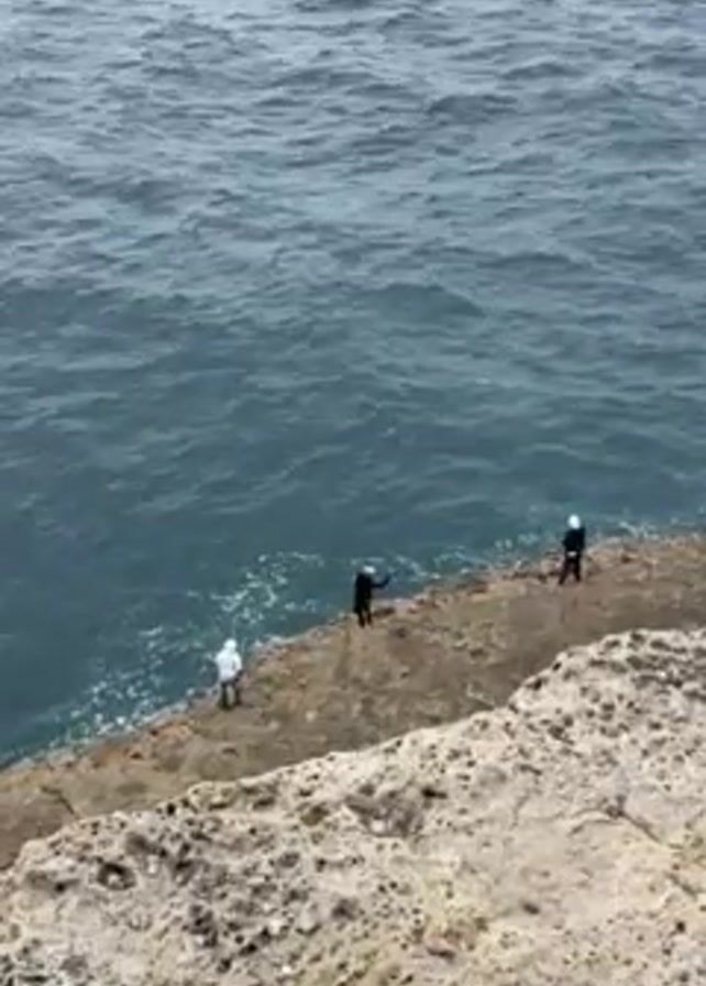 group of four individuals standing on a rocky coastline adjacent to the ocean. The camera is positioned at an elevated angle, looking down upon them and the sea. The ocean surface is visible with small waves, and the sky is overcast. The rocky land is gray and rugged, and the individuals are spaced apart along the edge, appearing to be fishing.