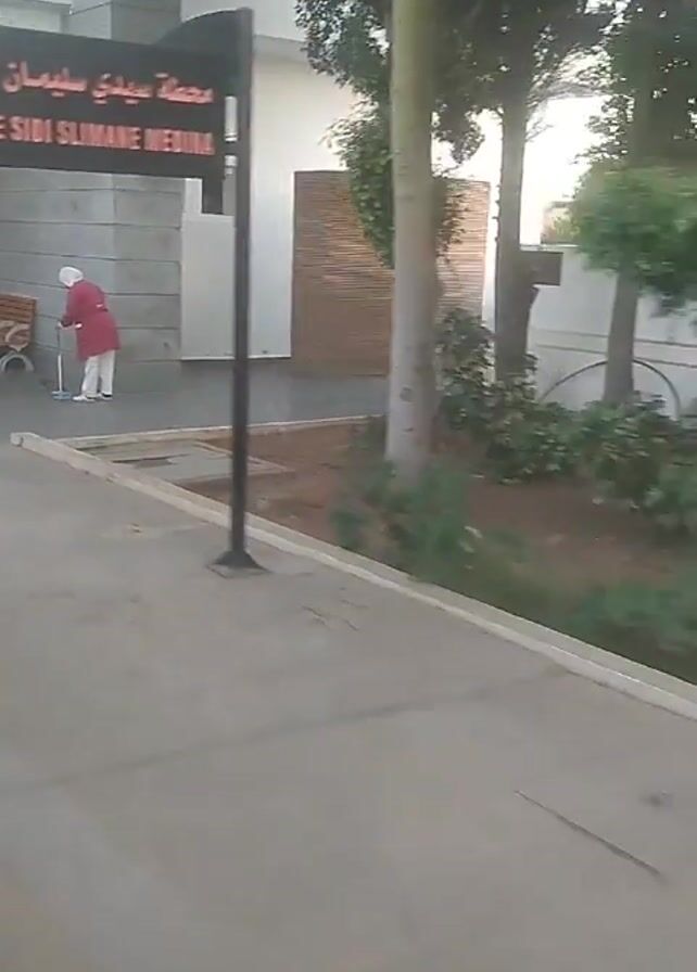 n outdoor scene, likely in front of a building. There is a sign that reads "GARE DE SIDI SLIMANE MEDINA" in both Arabic and French. A person in a red and white outfit is using a mop near a building. The surrounding area is paved and there are trees and bushes. A sign with a large "H" is also visible. The camera appears to be moving.