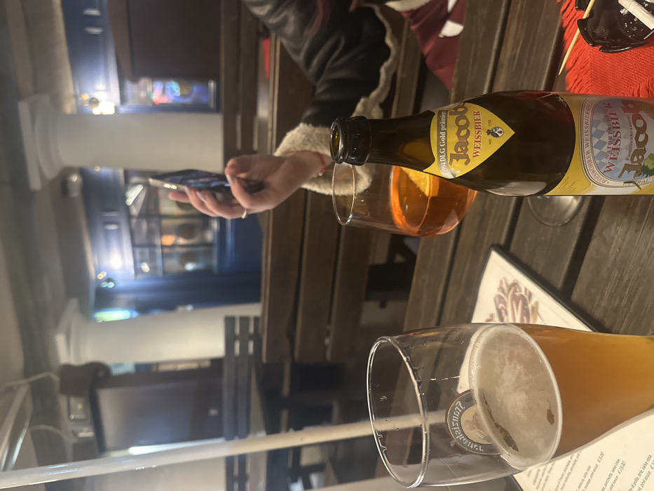 The image depicts a dining scene at Maxelâ Ristorante Bar, located at Vicolo Treviso, 39, 31100 Treviso TV, Italy. The setting is a covered outdoor or semi-enclosed area featuring dark wooden slatted tables and benches. Prominent white classical columns with capitals define the space, separating the foreground dining area from a dimly lit interior visible through large windows in the background. The interior exhibits dark blue tones and reflections of colorful lights. In the immediate foreground, on a wooden table, a tall, clear glass is positioned on the left, approximately half-filled with a light golden liquid and a head of foam. A menu is partially visible beneath this glass. To its right, an open brown glass bottle of "Jacob Weissbier" (1994 DLG Gold prämiert) stands on a red placemat. Behind the beer bottle, a stemmed glass contains an orange liquid with a citrus slice, consistent with an Aperol Spritz. A small black ceramic ashtray containing at least one cigarette butt is also present on the red placemat. To the right, a person's right arm, wearing a black jacket with a cream-colored fluffy collar, is visible. The person's right hand, adorned with a gold-colored ring on the ring finger, holds a dark-colored smartphone vertically, oriented towards the background, indicating an action of capturing an image or video.