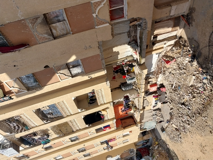 This image displays a heavily damaged residential area in Khan Yunis, Palestinian Territory