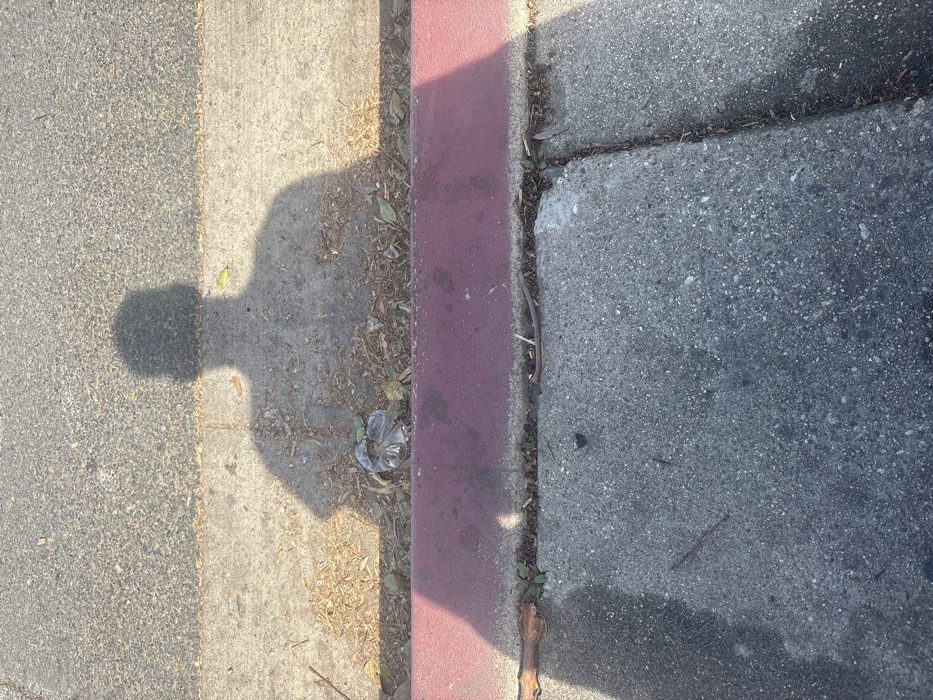 The image depicts an outdoor ground-level scene in Long Beach, United States of America, under bright sunlight. The upper portion of the frame shows a section of asphalt roadway. Below this, a strip of unkempt ground with dried leaves, twigs, and a crumpled clear plastic bag separates the road from a red-painted concrete curb. Below the curb is a section of concrete sidewalk, which is partially cracked and also contains small debris. A prominent dark shadow of a human figure, appearing to be the photographer, is cast across the asphalt, the debris strip, and the red curb. The shadow shows the head and upper torso of the individual, positioned as if facing away from the camera. The sunlight originates from the left and slightly behind the viewer, casting the shadow towards the right.