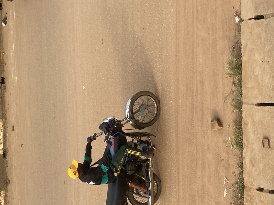 An overhead shot shows a person doing a wheelie on a motorcycle on a dirt road. The person is wearing a yellow hat and dark clothing with green accents. The motorcycle is dark in color and appears to be well-used. The background consists of a dirt road on one side and a sidewalk with grass growing next to it on the other side. A rock is located near the sidewalk.