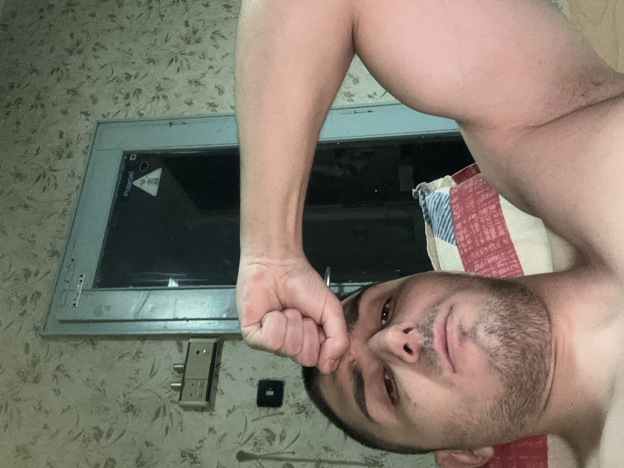 A medium shot captures a fair-skinned, light-haired man with a closely-shaved beard and brown eyes. He is shirtless and lying down, possibly in a bed. His right arm is raised and bent, with his fist near his forehead. The background includes floral wallpaper, a window or framed mirror with a "Polaroid" logo visible, and a lock mechanism on the wall. The location in the city of Sofia, Bulgaria, cannot be determined from the provided visual information.