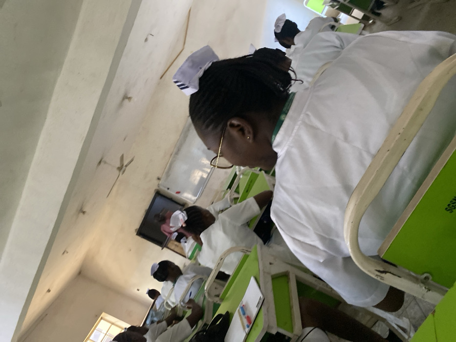Several nurses in white uniforms and caps are seated in a classroom-like setting. They are at individual desks with green dividers, and they appear to be focused on work or study materials. A television screen is visible in the background. The classroom has a worn appearance with a white ceiling, a ceiling fan, and a window providing natural light.