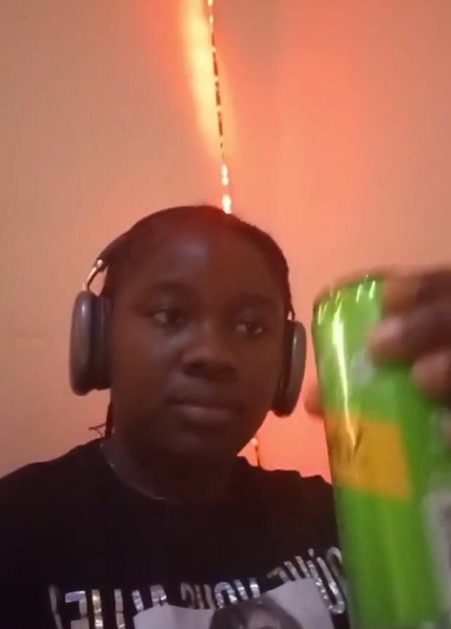 A person with dark skin and dark braids is shown from the chest up, wearing grey headphones and a black t-shirt with a silver design and a picture of a woman on it. They hold a green Schweppes can and drink from it. There are LED string lights visible behind them, cycling through colors. The background wall is a light beige color.