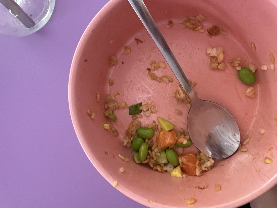 A pink bowl sits on a purple surface. The bowl contains remnants of a meal, including rice, edamame, salmon, and avocado. A silver spoon rests inside the bowl, its bowl pointing downward and slightly to the right. A portion of a clear glass is visible in the upper left corner of the image, with a utensil inside. The food scraps are scattered, indicating the meal has been finished or mostly consumed.