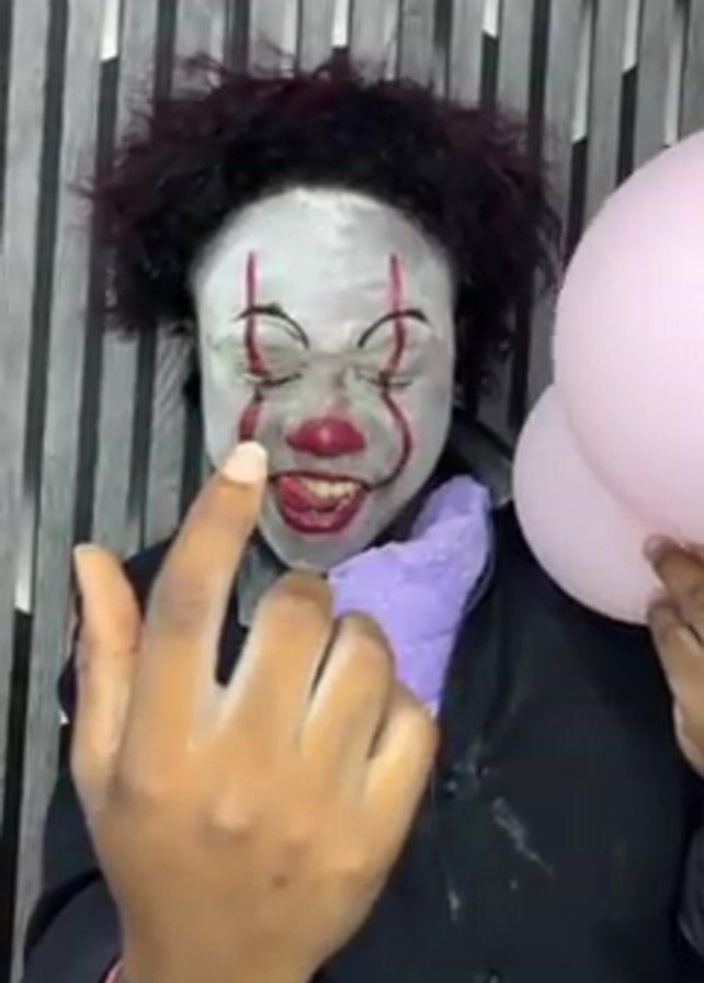 A person with a dark complexion, wearing white clown makeup with red accents, stands against a black and white striped background. They have dark, curly hair and are wearing a black jacket and a lavender ruffled scarf. In their left hand, they hold two light pink balloons. With their right hand, they point directly at the camera, displaying a sinister grin. The person is deliberately creating an unnerving clown persona.