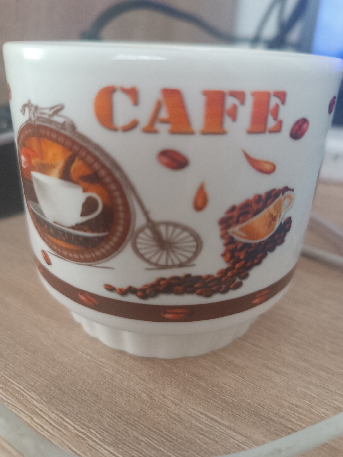 - "The image displays a single white ceramic cup, positioned slightly off-center to the right, resting on a light brown wood-grain surface" by FM-hnSgv2, licensed under CC BY 4.0