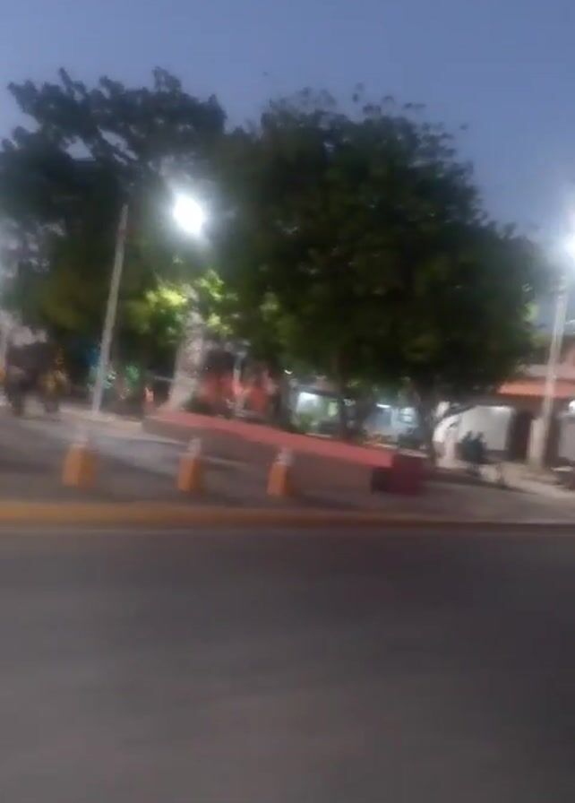 street scene at dusk. There are trees on either side of the street, and streetlights illuminate the area. A building is visible in the background. People are sitting on benches near the building. The camera appears to be moving along the street, with some blur visible. The lower left corner of the video includes the text "Infinix SMART 8".