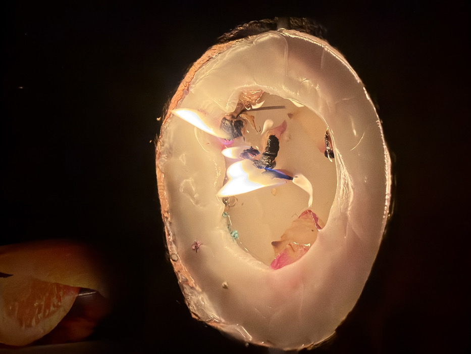 - "The image displays a close-up, top-down view of a burning candle contained within a natural, hollowed-out organic vessel, consistent with a halved coconut shell" by FM-aKWvB3, licensed under CC BY 4.0