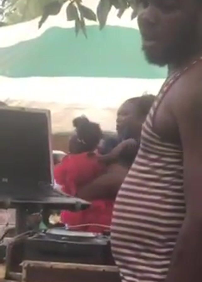 man standing in front of a sound system at an outdoor event. He is wearing a brown and white striped tank top. Behind him is a table with a laptop and sound equipment. In the background, people are gathered under a green and white canopy. A woman holds a young girl in her arms. The man seems to be addressing the crowd, and he briefly adjusts something on the sound system. There are trees and other foliage visible in the background, suggesting a park or garden setting.