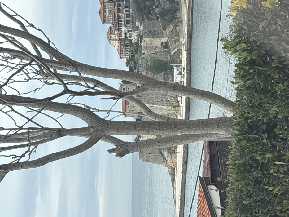 The image captures a detailed view of the coastal area of Ulcinj - Ulqin, Montenegro, under an overcast sky. In the foreground, the lower portion is occupied by dense, dark green shrubbery. Directly above, multiple bare, light grey tree trunks and branches with a gnarled appearance dominate the central frame, partially obscuring the background. A section of a building with a distinct orange-red tiled roof is visible on the lower left, behind the shrubbery. Thin, dark utility wires stretch horizontally across the mid-foreground. The midground features a calm body of light blue-green water, likely a bay or harbor. A grey stone quay with several parked vehicles and a small, white rectangular structure is visible along the water's edge on the right. The background is characterized by the historic Ulcinj Old Town. Prominent, light grey stone fortress walls rise steeply from a rocky promontory on the left, extending along the coastline and into the water. Above and behind these fortifications, numerous multi-story buildings with characteristic orange-red tiled roofs ascend a hillside. The open sea stretches to the horizon on the far left, meeting a hazy, uniformly cloudy sky. No individuals or discernible actions are present in the scene.