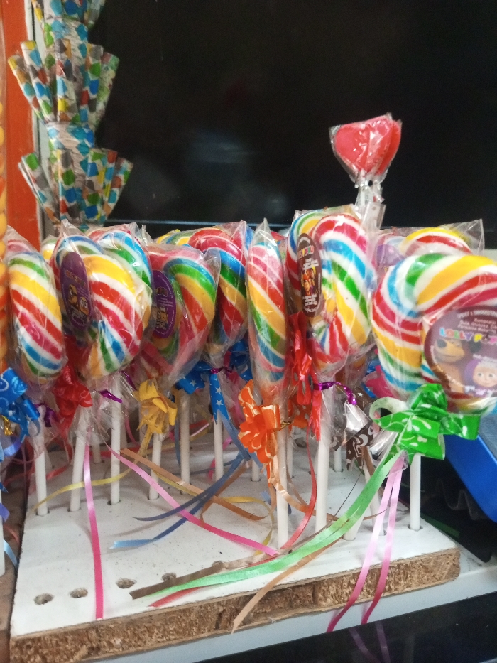 - "A display of colorful, individually wrapped lollipops with ribbons adorn the sticks" by FM-aMjHv1, licensed under CC BY 4.0