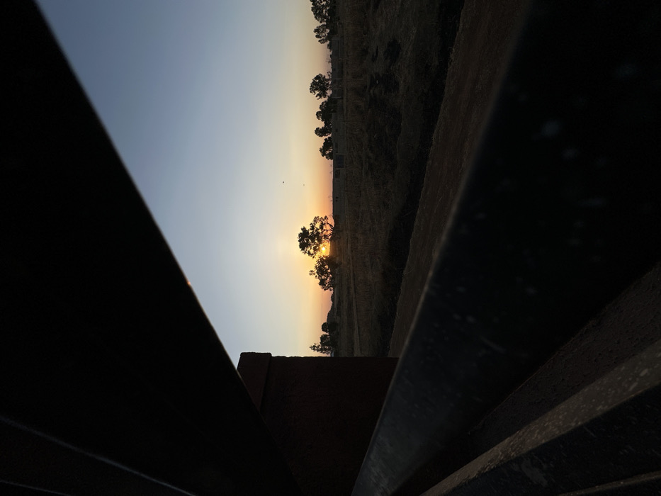 A landscape sunset is framed by dark, structural elements in the foreground. The sun glows behind a silhouette of trees on the horizon. The sky fades from light blue to orange near the horizon, with additional trees lining the ridge. The foreground details consist of a dark, possibly metallic, framework.