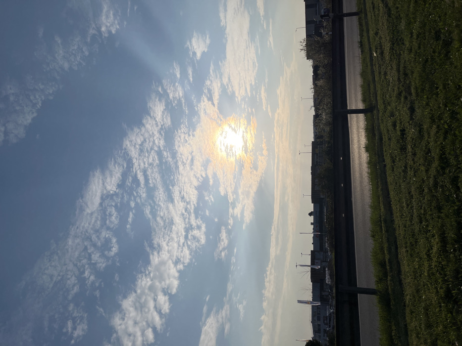 The scene depicts an exterior daytime view in Neu-Edingen, Germany. The upper two-thirds of the frame feature a blue sky extensively covered with white, patchy clouds. The sun is centrally located towards the upper right, appearing as an intense golden-white orb partially obscured by clouds, with visible rays emanating outwards. The mid-ground reveals a horizon line composed of the dark silhouettes of multiple large, low-rise commercial or industrial buildings, characterized by flat roofs. Several tall, slender lampposts are visible above these structures, and white rectangular banners are present on the far left. The foreground comprises a strip of green grass, bordered by a horizontal dark grey metal W-beam guardrail. Beyond the guardrail, a two-lane asphalt road is visible, exhibiting a reflective surface from direct sunlight. No individuals or specific activities are observed within the frame.