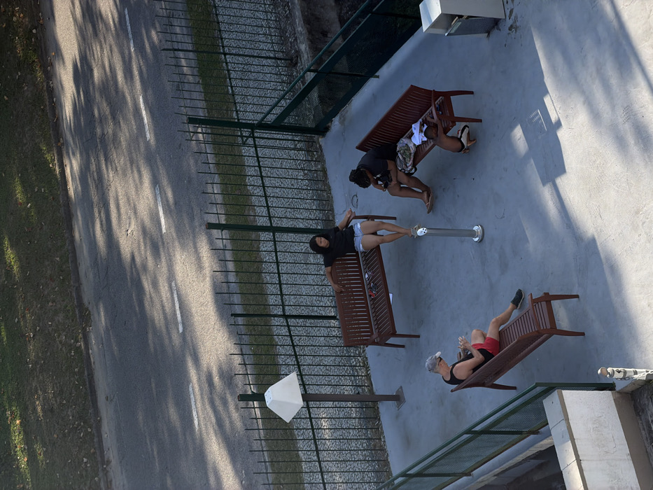 Three people are relaxing outdoors. One person is reclining on a wooden bench with their legs stretched out and feet touching a silver pole. Two other people are resting together on a bench, one leaning on the other. Wooden benches are spread around the patio area. A fence separates the patio from a nearby road and grassy area. A white sign is situated close to the fence.