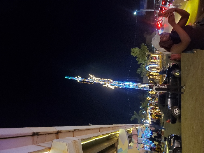 Night scene with a large, illuminated structure resembling a Christmas tree stretching upwards into the dark sky. People are gathered around the base of the structure, enjoying the festive lights. A person stands nearby, possibly taking a photo. Cars are parked on the side of the road, and additional lights adorn the surrounding area, creating a vibrant and lively atmosphere.