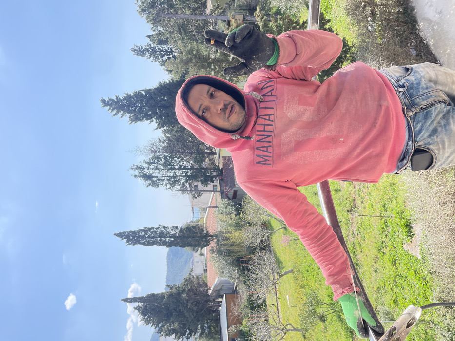 An adult male is depicted from the waist up, standing outdoors on an elevated platform or balcony in the city of Čanj, Montenegro, under a clear blue sky. He faces the viewer directly, wearing a pink hooded sweatshirt with the word "MANHATTAN" printed on the chest, and light-wash blue jeans. A black smartphone is partially visible in his right front jean pocket. He wears a black work glove on his right hand and a bright green work glove on his left hand. His right hand is raised, with the index and middle fingers extended, holding a lit cigarette or cigarillo between them. A green elastic band is visible on his right wrist. His left hand rests on a dark-colored railing, appearing to grip a silver metallic object, possibly an electrode holder or welding rod. The background shows a residential area with houses, some featuring red-tiled roofs, set amidst dense green vegetation, including tall coniferous trees and leafless deciduous trees. Distant mountains are visible, and a small segment of the sea is discernible beyond the structures. The sky is largely clear with minimal clouds.