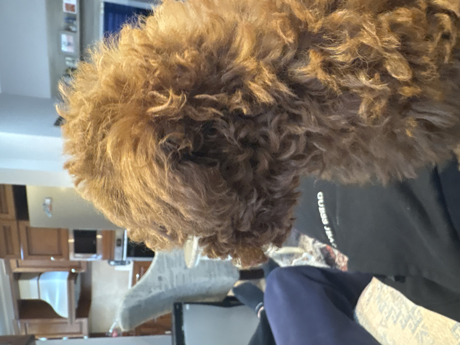 The image displays an indoor residential scene in Plovdiv, Bulgaria. A curly-haired dog with reddish-brown fur is the primary subject, positioned in the right and central foreground, viewed from its left side and rear as it looks away from the camera. In the lower-left, a portion of a human's legs is visible; one leg is clad in dark blue trousers, and a foot in a dark sock. The person's black garment bears inverted white text, partially legible as "GUESS JEANS." The background reveals a kitchen area featuring wooden cabinetry, a stainless steel range hood, a microwave oven, and a silver refrigerator. Adjacent to this, a light-colored, patterned upholstered chair is visible.