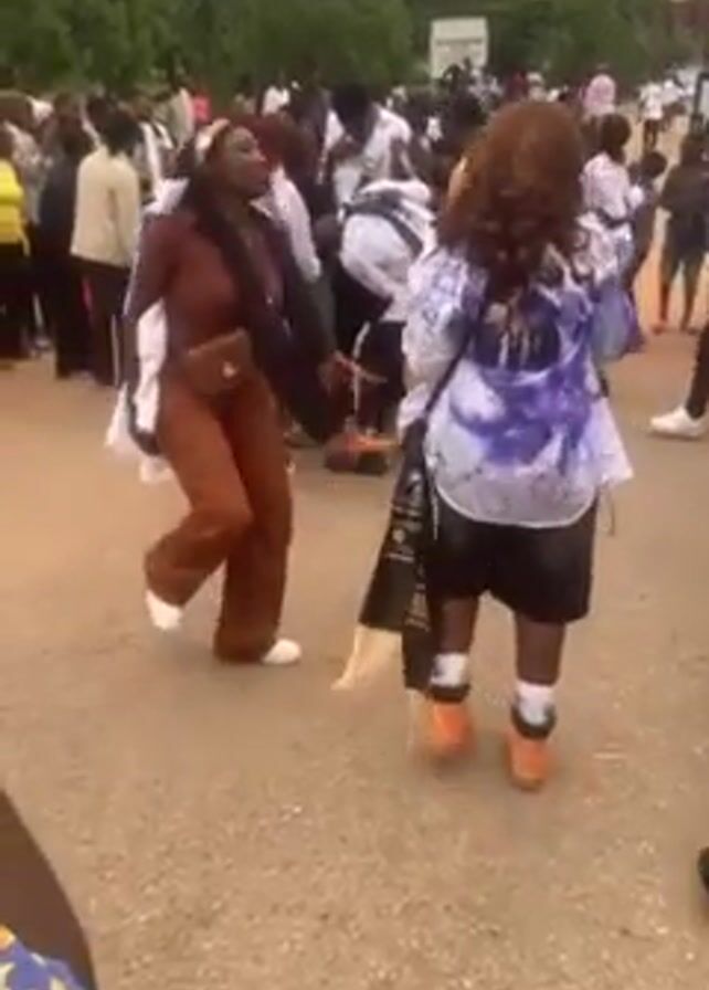 gathering of people, mostly dressed in white shirts. Some are dancing and moving around. The environment appears to be an outdoor setting, possibly a road or open area, with trees in the background. Some of the people are taking photos or videos of the dancing. There's also a car visible in the frame.