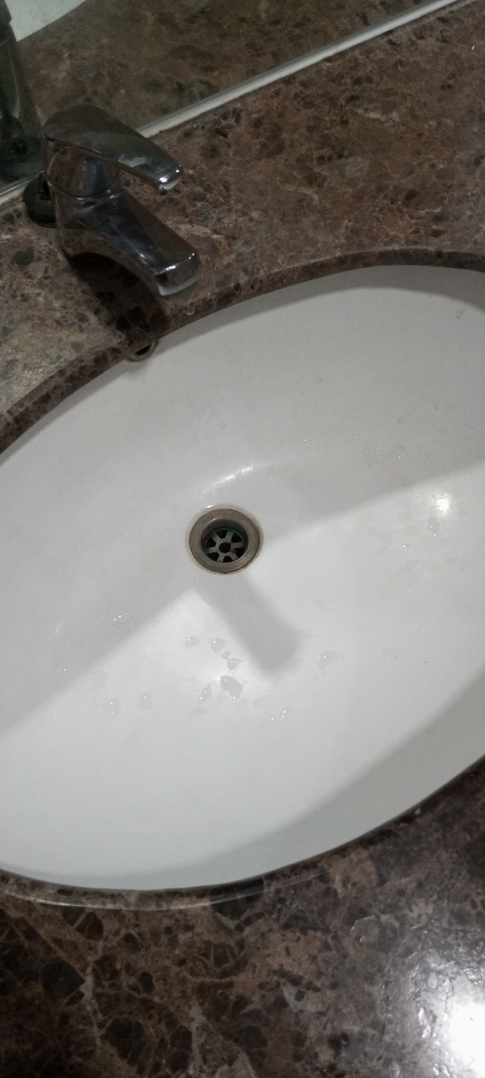The image displays a close-up, downward-angled view of a white, oval-shaped ceramic sink set into a dark brown, veined marble countertop, located in Aral, Kyrgyzstan. A chrome, single-handle faucet is mounted centrally on the countertop at the rear of the sink. The sink basin contains several small, clear water droplets and a prominent shadow cast by the faucet. A circular chrome drain cover with a patterned grate is visible at the bottom center of the sink. A narrow strip of a mirror, reflecting portions of the faucet and countertop, is visible along the top edge of the image. No individuals are present in the scene, and no active actions are depicted.