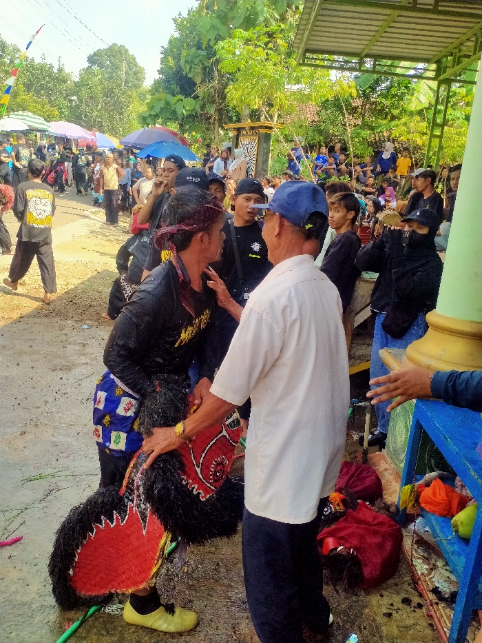 An outdoor scene in Kerjo, Indonesia, depicts a public gathering around a traditional performance. In the foreground, a man, visibly wet, wears a black long-sleeved shirt with light lettering, a red cloth headband, and a patterned blue and white sarong-like garment over dark pants, paired with yellow-green athletic shoes. He is holding a wet, dark, shaggy costume piece resembling a stylized horse, featuring red and white accents, consistent with a Jaranan or Kuda Lumping performance. Adjacent to him, an older man, seen from the back, wears a light beige short-sleeved collared shirt, dark blue pants, a blue baseball cap, and glasses. He has a gold-colored watch on his left wrist. His right hand is extended towards the wet man's upper body, suggesting an interaction or assistance. The ground around them is wet and appears muddy. To the immediate right, a blue wooden structure, possibly a stand or bench, holds various textile items, including folded red and orange fabrics. Further back, a dense crowd of onlookers is gathered on both sides of a dirt road or open area. Many individuals wear dark clothing and baseball caps. Some in the midground are under colorful umbrellas (blue, pink, white) to shield from the sun. A person on the right midground wears a black face covering and appears to be holding a small percussion instrument. In the background, a large group is seated on a raised platform or bleachers. Lush green trees and foliage dominate the upper background, under a bright sky. A decorative, ornate gate or sign structure is visible in the left midground. A colorful striped pole stands on the far left. The overall scene suggests a vibrant community event or festival.
