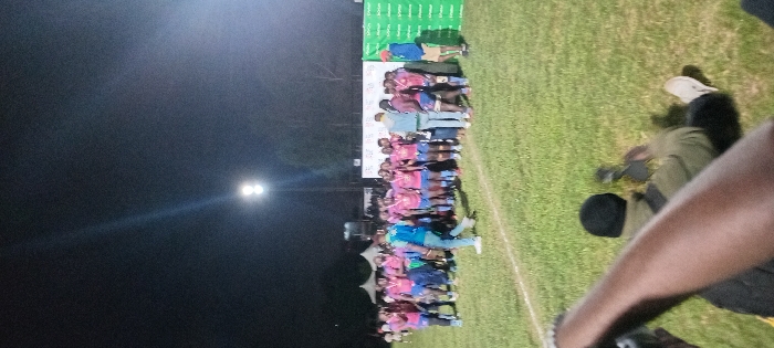 The image displays an outdoor night scene on a grass sports pitch, likely in Nairobi, Kenya, under artificial floodlighting