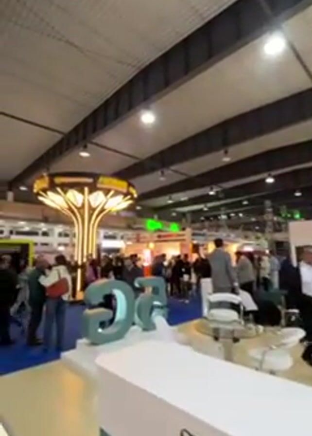 The video pans across a large, busy indoor space, seemingly a technology expo. Many people are walking around, and various booths are visible. In the foreground is a booth for "SYNAMORE Technologies," featuring large, turquoise "5G" lettering. A brightly lit, tree-shaped structure stands prominently in the center of the room. The floor is covered with a blue carpet. The ceiling is high, with exposed beams and industrial lighting.