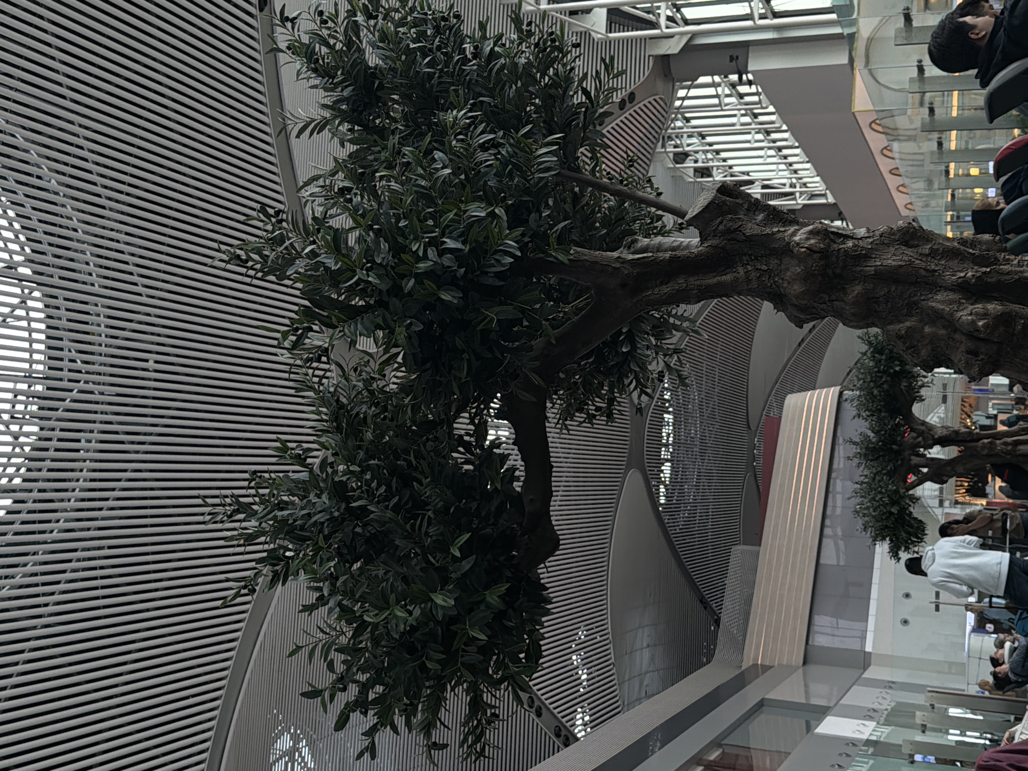 The image depicts an interior setting in Arnavutköy, Turkey. An olive tree is positioned in the foreground, its trunk extending horizontally towards the right. The tree is situated in a modern architectural space with a metal facade of horizontal lines and a curved design. People are visible in the background, some sitting, some standing, with indistinct interactions. The environment suggests a public or commercial space, likely an airport or similar transportation hub given the presence of seating and waiting areas.