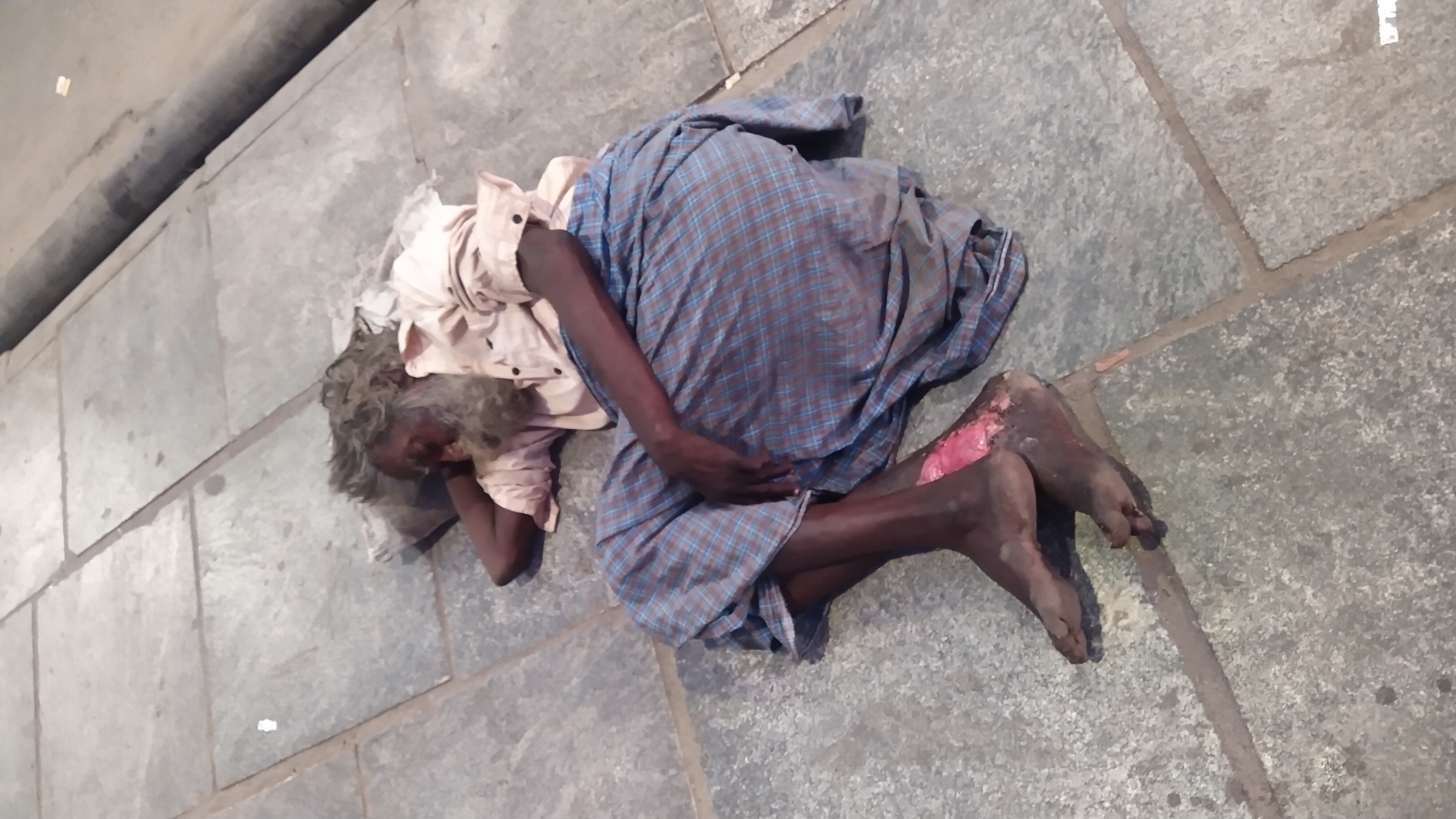 An individual, presumed male and elderly, with dark skin, matted grey hair, and a long grey beard, is depicted lying on a paved surface. The subject is curled on their right side, with the right hand positioned under the head, resting on a crumpled white object serving as a makeshift pillow. They are wearing a light-colored (faded pink or off-white) collared shirt with sleeves rolled to the forearms, and a blue and brown plaid lungi or sarong covering the lower body. The left lower leg exhibits a significant, open, red wound or ulcer on the ankle area, exposing raw tissue. The bare feet appear dark and possibly calloused. The paved surface consists of large, light grey, square-cut stone or concrete slabs with visible grout lines. In the upper right background, a dark, indistinct area is visible with a horizontal cylindrical object, possibly a pipe or curb. The scene is illuminated by dim, possibly artificial, light. The specific location within the city of Chennai, India, cannot be definitively identified from the visual information provided in the image.