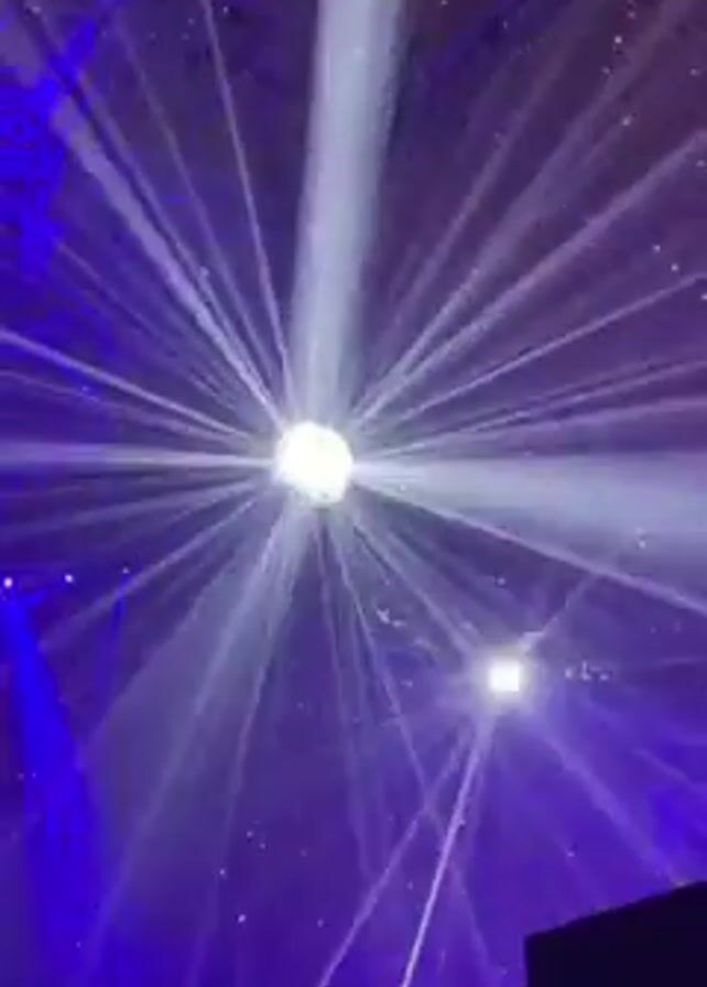 disco ball hanging from the ceiling. The disco ball is reflecting light in all directions. There are blue lights shining on the disco ball and the ceiling. The video is taken from a low angle, looking up at the disco ball. The background appears to be dark, likely an enclosed event space. Some architectural details are visible at the bottom of the frame.