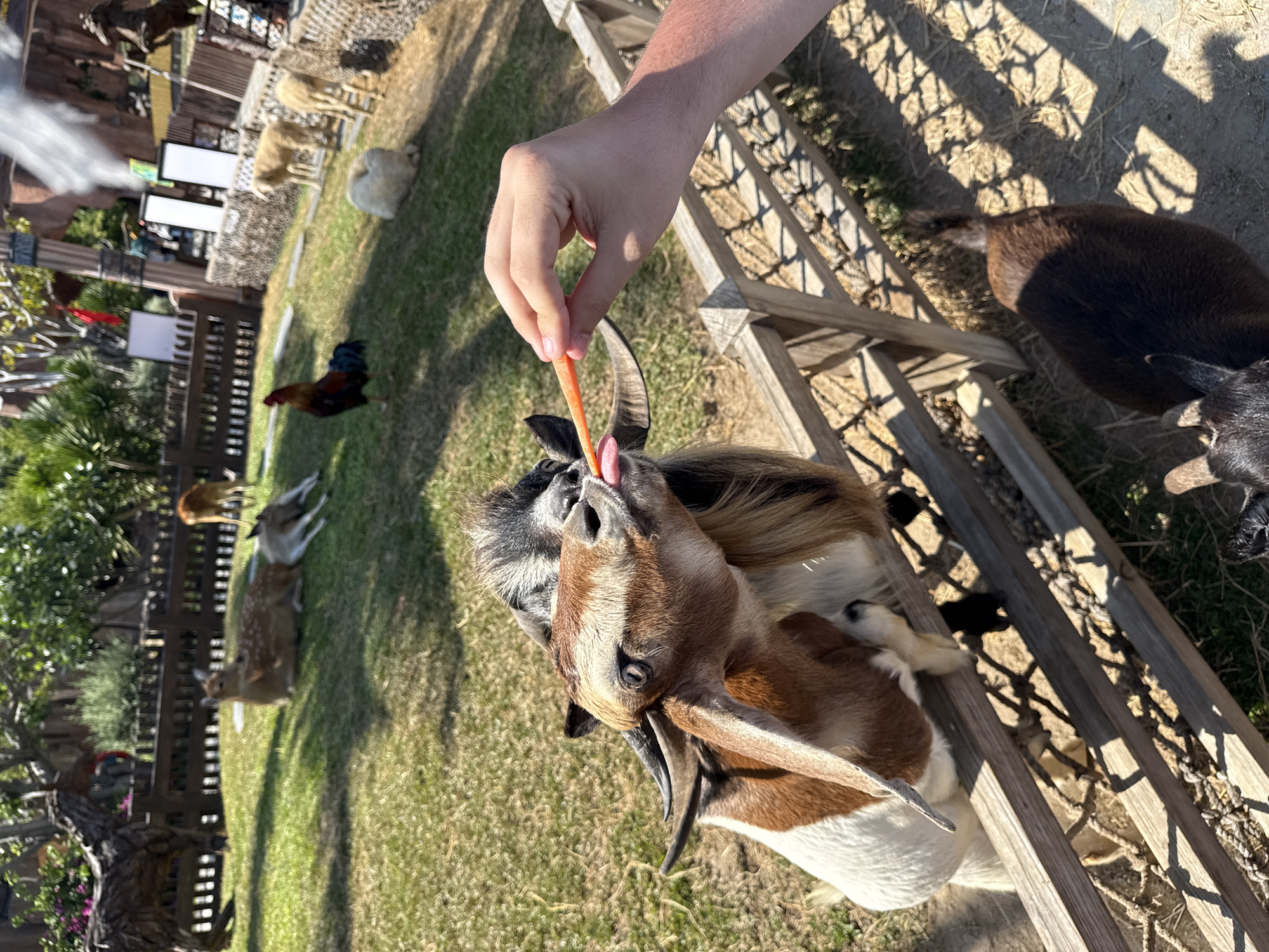 A close-up shot shows a person's hand holding a carrot and feeding a goat with long horns, its pink tongue extended to reach the carrot