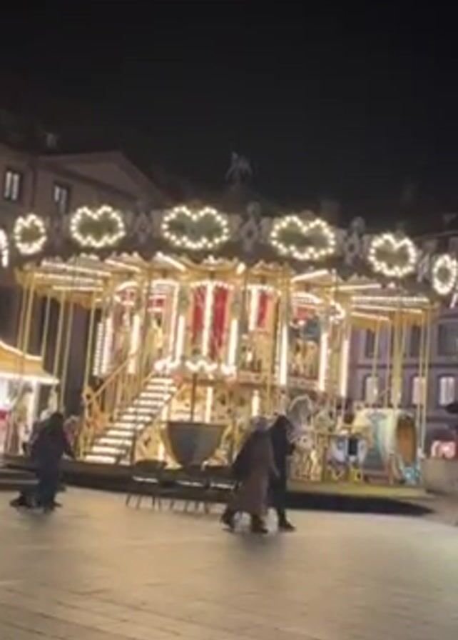 At night, a carousel stands brightly lit in a public square. It has two levels, with a staircase leading to the upper level. The carousel is decorated with numerous lights. A small group of people are standing near the carousel, seemingly observing it. Other people are walking in the square around the carousel. Buildings surround the square, dimly lit against the dark sky.