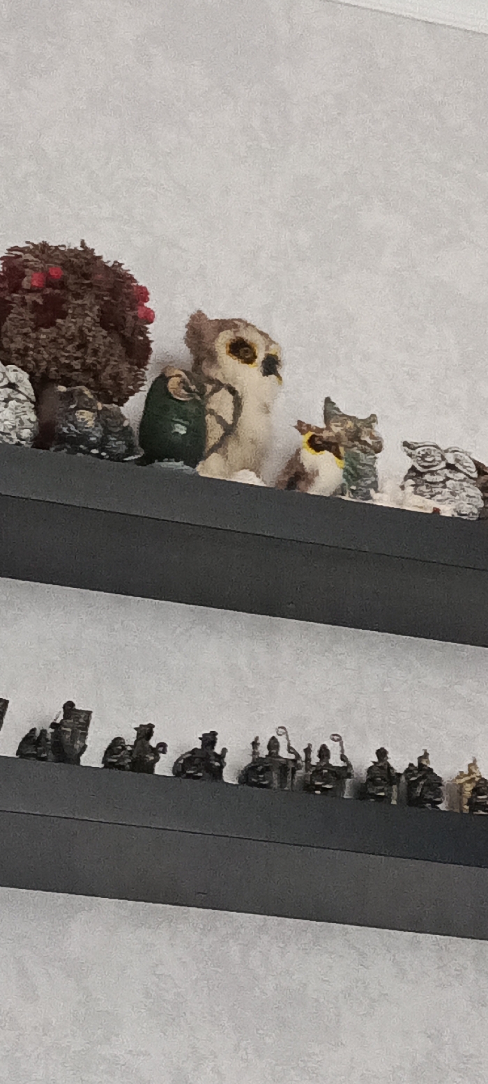 This image depicts two dark-colored shelves mounted against a light grey, textured wall in an indoor setting within the city of Novoshakhtinsk, Russia. The top shelf displays a collection of decorative figurines, including a miniature tree with red berries on the left, several greyish-white abstract or rock-like ornaments, a dark green figure, and a series of owl figurines of varying sizes, predominantly in brown, white, and yellow tones. The largest owl is light brown and white with prominent yellow eyes, positioned centrally. The bottom shelf presents a linear arrangement of approximately ten dark, stylized figurines, which appear to be part of a chess set or similar themed collection. These figures include what resemble bishops with croziers and other humanoid forms, with one figure on the far right appearing lighter, possibly gold-toned. The scene is static, devoid of human presence or active interactions.