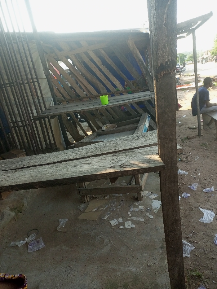 This image depicts a makeshift roadside stall in Zango-ndaji, Nigeria, under bright daylight. The foreground features an uneven dirt and concrete ground littered with torn clear plastic bags and numerous fragments of shattered light-colored material, possibly glass or ceramic. To the left, a crudely constructed wooden stall is visible, composed of rough-hewn planks forming shelves and a partial wall, with visible blue tarpaulin material within its structure. A bright green plastic cup rests on an upper wooden shelf, and a light-colored plate is on a lower shelf within the stall. On the far right, a male individual wearing a dark blue short-sleeved shirt is seated on a wooden bench or low table, facing away from the camera and looking towards a paved road visible in the background. The road shows parked motorcycles and other distant vehicles, suggesting a commercial or residential street. A thick, dark wooden post stands vertically in the mid-right, supporting the stall's roof structure.