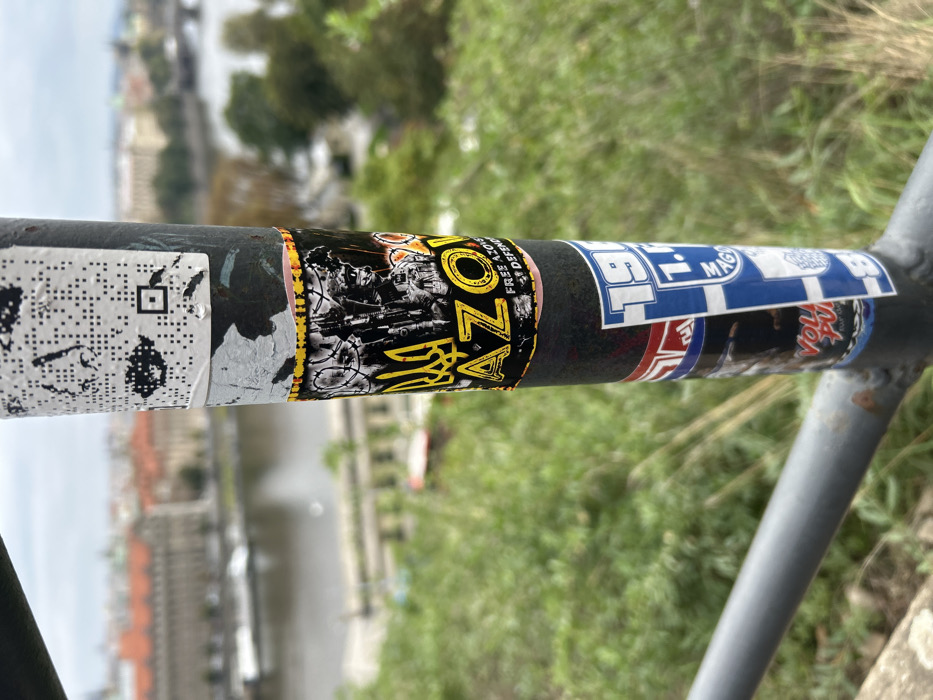 An elevated, outdoor scene in Prague, Czechia, specifically from what appears to be Letná Park, overlooks the Vltava River and cityscape. The primary subject is a weathered, dark gray vertical metal pole from a railing system, occupying the foreground and right of center. The pole is affixed with several stickers. Prominently displayed is a black rectangular sticker featuring the yellow Ukrainian "Tryzub" emblem, the bold yellow text "AZOV," and smaller white text "FREE AZOV * DEFENDERS." This sticker also depicts a soldier with a firearm and barbed wire. Above it, a partially torn white sticker displays fragmented black patterns resembling a stylized QR code and an eye-like symbol. Below the "AZOV" sticker, a partially visible blue and white sticker shows "19" and "1.F" text, overlapping another sticker with "VOL" text. A horizontal gray metal railing bar connects to the vertical pole in the lower left. The midground consists of a steep, lush green hillside. The background reveals the Vltava River, bordered by a dense urban environment of multi-story buildings with characteristic orange-red tiled roofs. A bridge spans the river in the distant background. The sky is overcast. No individuals are present.