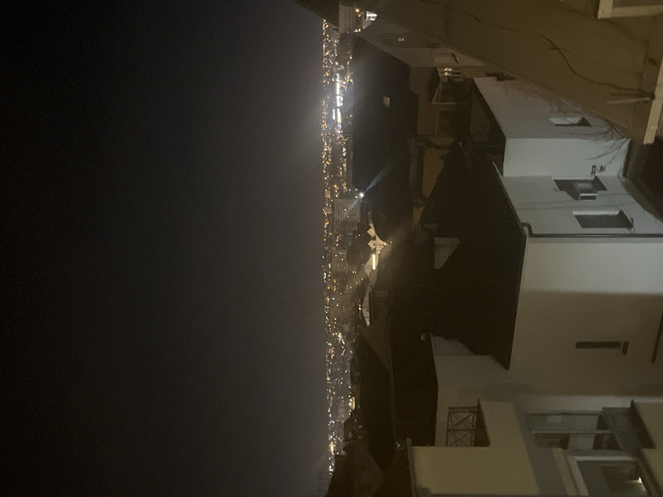 A nighttime view showcases a city skyline extending far into the distance, with numerous lights illuminating the urban landscape. Adjacent to the illuminated city, the architecture of a building with white walls and dark gabled roofs is evident. The image is dark and could be considered low resolution.