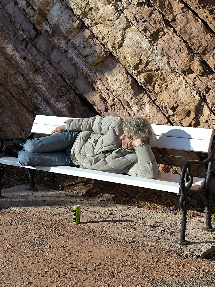 In Perazića Do, Montenegro, a person is depicted lying on their right side on a white park bench with black, ornate metal supports. The individual, who has light-colored curly hair, is dressed in a light-colored quilted puffer jacket, blue jeans, and dark footwear. Their head is propped by their right hand, with the right elbow resting on the bench. Knees are bent. On the reddish-brown gravel ground beneath the left side of the bench, a green cylindrical beverage can stands upright. The background features a prominent, steeply angled rock face composed of reddish-brown and tan strata, partially illuminated by direct sunlight which casts shadows. Scattered debris, including a piece of white paper or tissue, is visible under the bench.
