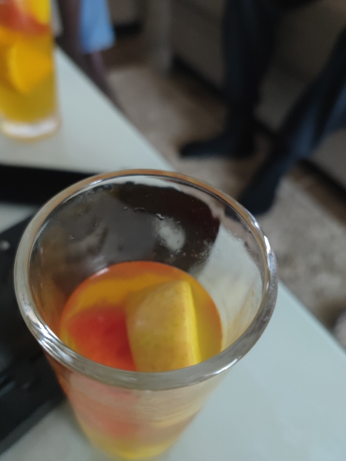 The scene depicts an indoor setting in Oloolua ward, Kenya. In the immediate foreground, a clear glass contains a yellowish liquid with several submerged fruit slices, one prominently displaying red and yellow/orange coloration. This glass rests on a light-colored, reflective surface, likely a table. To the left, a second, out-of-focus clear glass holding a similar beverage is partially visible. The background reveals two individuals in a relaxed posture. One individual's upper body, including an arm clad in a light blue sleeve, is visible to the left. To the right, the lower legs and feet of another individual, wearing dark trousers and dark socks, are visible, resting on a light brown or beige carpeted floor. A section of light-colored furniture, possibly a sofa or armchair, is discernible behind the second individual's legs.