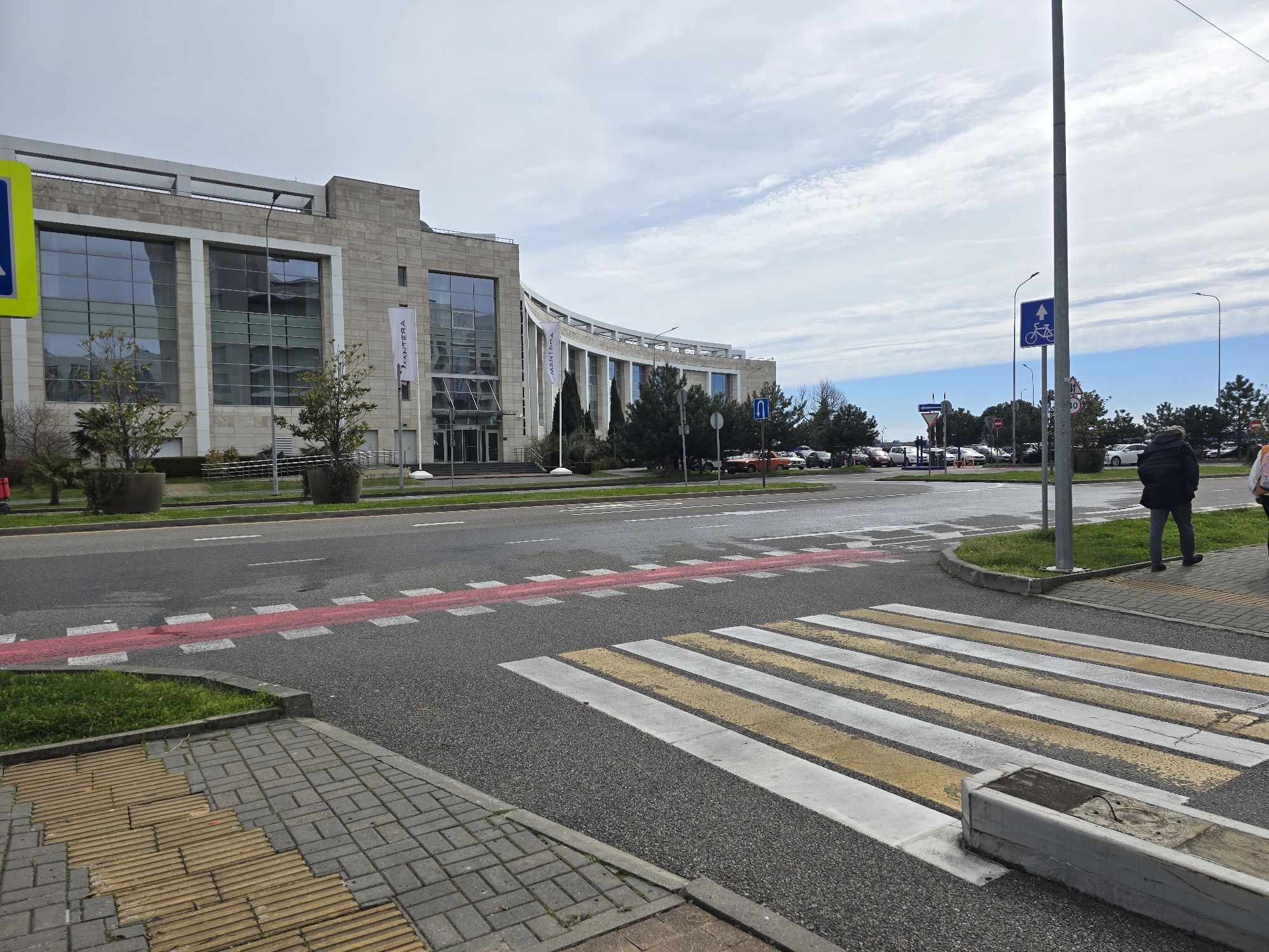 street scene in Sirius, Russia. A pedestrian crosswalk with yellow and white stripes is in the foreground. A red-marked lane is adjacent to the crosswalk. A person is walking on the sidewalk. Across the street is a modern building with large windows and a curved architectural design, bearing a "MANTERA" sign. Several vehicles are parked in the background. A blue and white bicycle route sign is visible. The sky is overcast.
