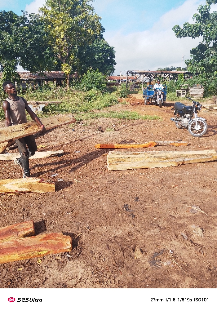 The image captures an outdoor lumber processing or storage area in Zango-ndaji, Nigeria, under a partly cloudy sky
