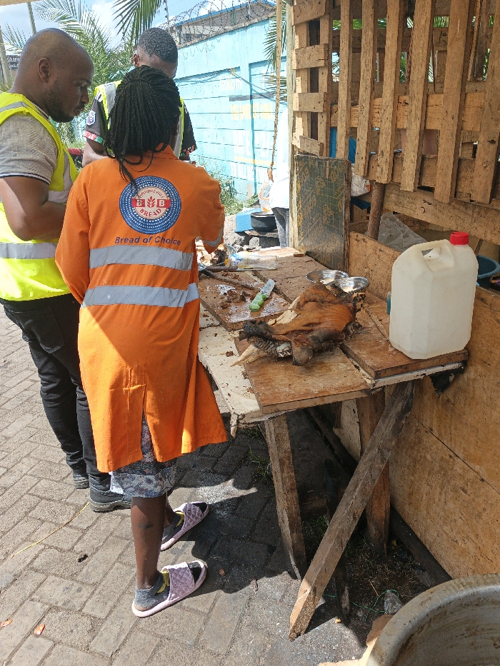 The image captures a street vendor stall in an urban area of Nairobi, Kenya. Three individuals are visible. In the foreground, a person with braided hair, wearing an orange long-sleeved tunic with reflective stripes and a circular logo for 'B & B Bread of Choice,' stands with their back to the camera, facing a makeshift wooden table. They wear patterned shorts and pink open-toed slippers over dark socks. To their left, a man with a balding head and beard, wearing a yellow high-visibility vest over a light-colored t-shirt, observes the table. A third individual, partially obscured by the first person, is visible in the background wearing a dark t-shirt. On the unpainted wooden table, a roasted animal head, likely from a goat or sheep with horns attached, is centrally positioned. Nearby are smaller pieces of dark, cooked meat and a green-handled knife. Two small metallic bowls are also present on the table. A large white plastic jerrycan with a red cap rests on the right side of the table. The ground is paved with interlocking concrete blocks. In the background to the left, a light blue wall topped with barbed wire is visible, with palm foliage extending above it. To the right, part of a wooden structure, forming the stall, is seen. A dark metallic pot is partially visible in the bottom right corner of the foreground, and another dark pot is on what appears to be an outdoor cooking setup in the mid-ground. The scene is illuminated by daylight.