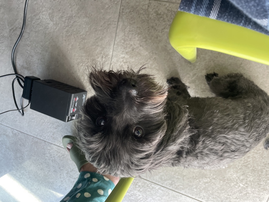 A gray, fluffy dog lies on its back on a tile floor. The dog's head is tilted upward. Beside the dog is a black surge protector with cords plugged into it. The lower left of the frame shows a person's leg wearing green and white polka dot pants and green shoes. A lime green chair leg is visible under the person's leg and at the top right of the frame. A blue blanket with a pattern is partially visible in the upper right.