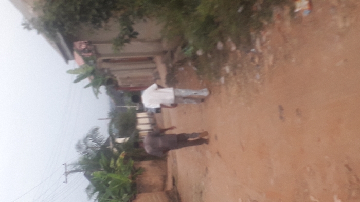 A slightly out-of-focus shot shows two men walking along a dirt road lined by buildings and vegetation. The man in the front wears a light-colored shirt. The man behind him wears a darker shirt. There is trash along the side of the road and utility poles. The sky is overcast.