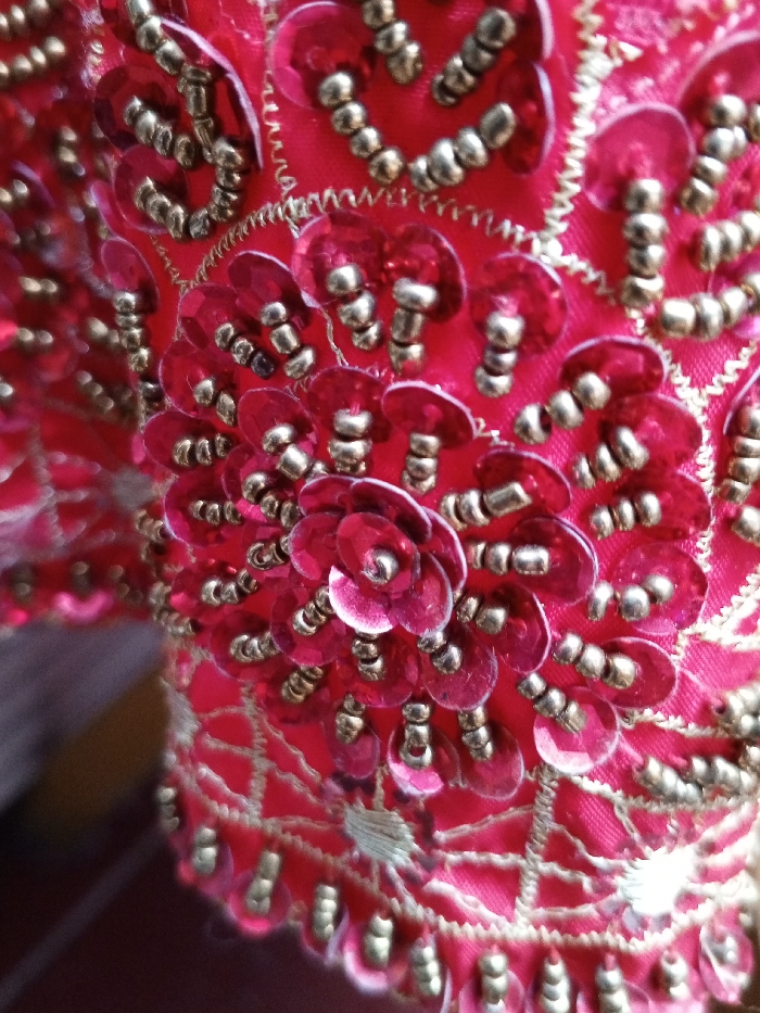 - "A close-up shot reveals vibrant red fabric intricately adorned with sequins and beads" by FM-Z0D4I2, licensed under CC BY 4.0