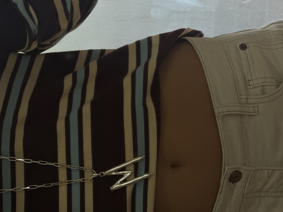 The image displays a close-up, mid-torso view of an individual. The specific location within Mexico City, Mexico, is not discernible from the image; the background appears to be an indistinct, light-colored indoor surface. The subject is wearing a long-sleeved, horizontally striped crop top with dark reddish-brown, light blue, and beige stripes. A silver-toned metallic necklace with a large, stylized "M" pendant hangs centrally on the chest, resting above the visible navel. The lower garment consists of light beige or off-white denim shorts or pants, featuring a visible metal button on the waistband and stitched pocket details. No direct interactions or specific actions beyond posing are observable.
