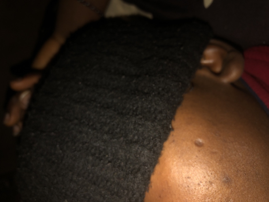 A close-up shot presents an individual's head, predominantly showcasing a tightly fitted, black knit cap or covering their hair. Part of an ear is visible, along with a patch of skin with a small mole. The person's fingers are also visible. The image is somewhat dimly lit, lending a casual, almost candid feel to the composition.