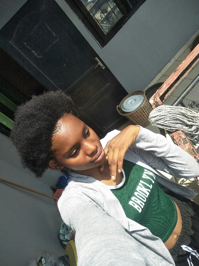 The image depicts a young Black female in an outdoor or semi-enclosed residential setting in Cotonou, Benin