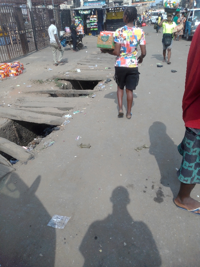 A street with exposed sewage holes and loose wooden boards. A woman with a box walks past, along with other pedestrians. Litter and refuse are scattered around the area. The scene appears to be a busy marketplace or commercial area in a developing country, characterized by poor infrastructure and pedestrian traffic.
